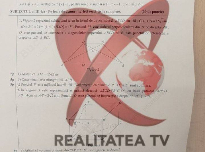 Site-ul nostru, www.realitatea.net, publică, în continuare, subiectele de la examenul de joia trecută. Iată, așadar, ce subiecte au picat la Matematică.