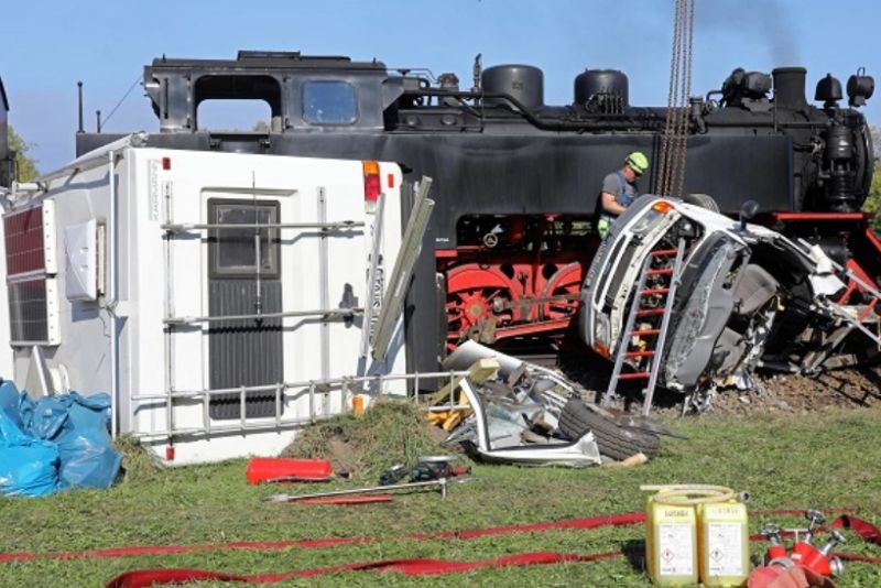 FOTO | 2 persoane în stare gravă, după ce o autorulotă s-a izbit violent de un tren de epocă, în Germania