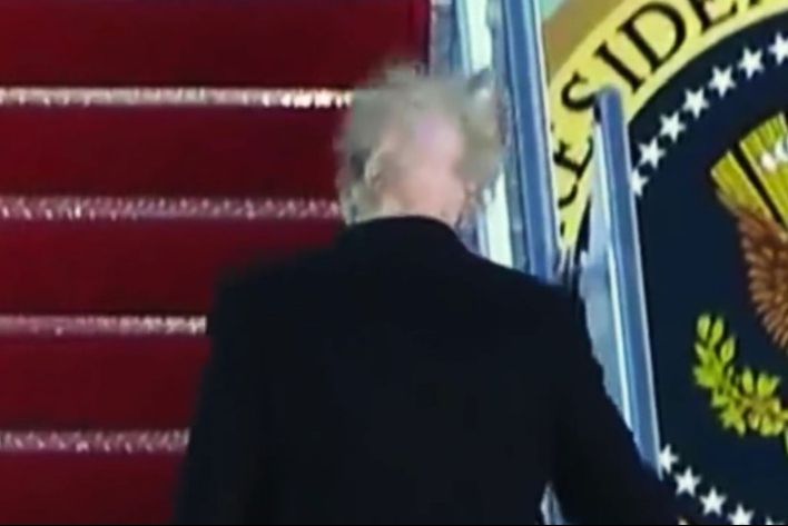 Trump, care poartă de obicei o şapcă atunci când urcă în aeronavă, nu a purtat una pentru această ocazie, iar camerele prezente au capturat imaginea coafurii preşedintelui SUA, care ascunde faptul că acesta este chel aproape în întregime în partea din spate a capului.