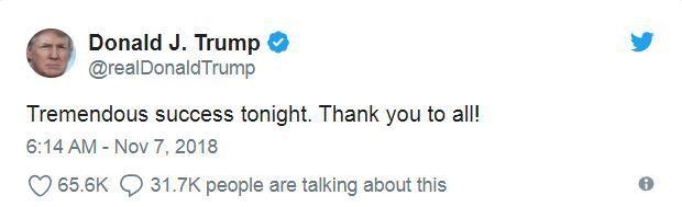 UPDATE: Înfrângerea în Camera Reprezentanților nu l-a atins pe Donald Tump, cel puțin nu la nivel retoric. El a anunțat un ”succes formidabil” și a mulțumit alegătorilor, în stilul său binecunoscut.
