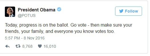 "Astăzi, votul se dă pentru progres. Mergeţi să votaţi, şi apoi asiguraţi-vă că familia, prietenii şi toţi cei pe care îi cunoaşteţi vor vota", a scris Barack Obama, pe Twitter.