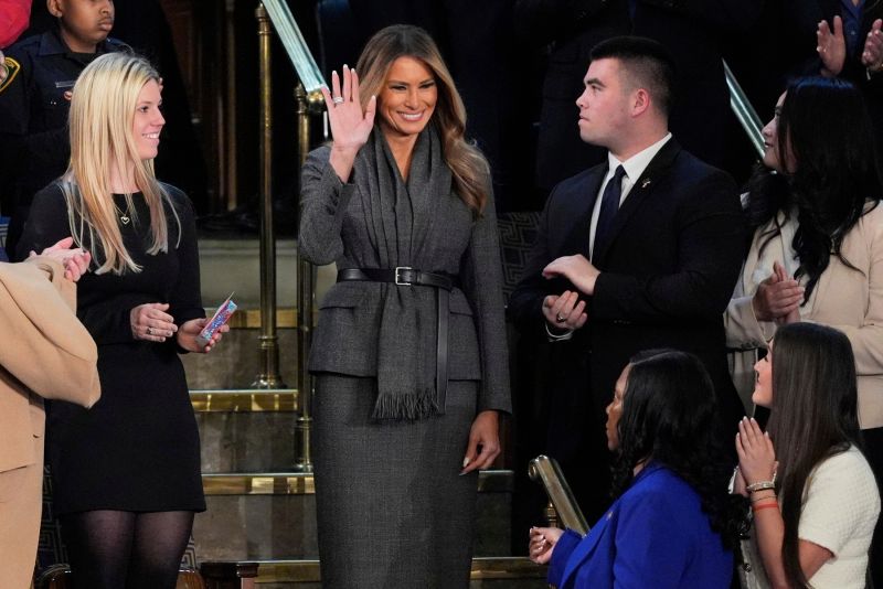 Melania Trump intră în sală şi este aplaudată. Poartă un costum deux pieces sobru, de culoare gri metalizat.