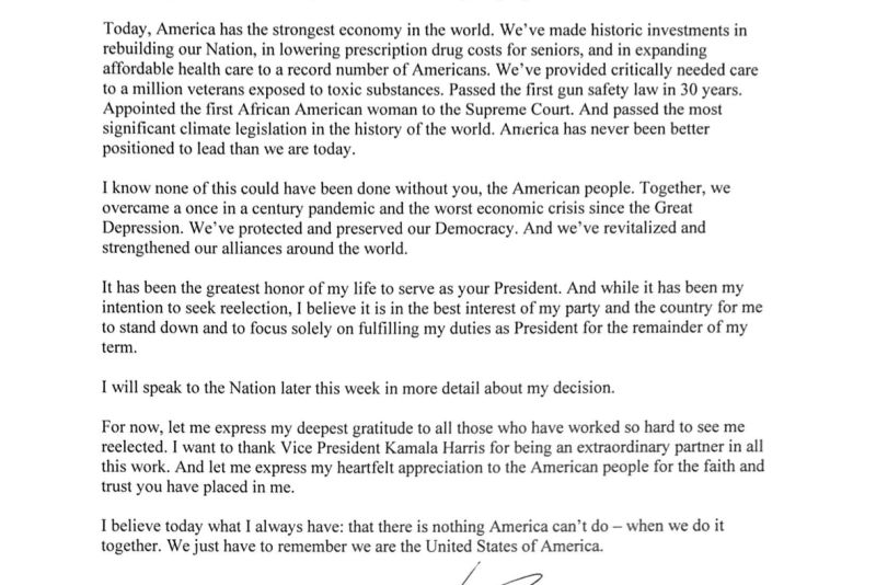 SCRISOAREA lui Biden în care a anunţat că renunţă să mai candideze la preşedinţie SUA - Textul integral