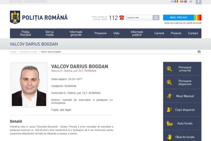 Profilul de urmărit general oferă și umătoarele detalii despre Darius Vâlcov: „Împotriva celui în cauză Tribunalul București - Sectia I Penală a emis mandatul de executare a pedepsei inchisorii nr. 1/02.05.2023, fiind condamnat la o pedeapsă de 6 ani închisoare pentru săvârșirea infracțiunilor de trafic de influență și spălare a banilor”, se arată pe site-ul Poliției.