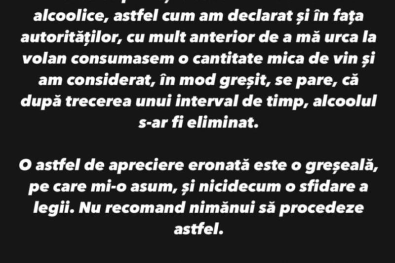 „În ceea ce privește consumul de băuturi alcoolice, astfel cum am declarat și în fața autorităților, cu mult anterior de a mă urca la volan consumasem o cantitate mică de vin și am considerat, în mod greșit, se pare, că după trecerea unui interval de timp, alcoolul s-ar fi eliminat. O astfel de apreciere eronată este o greșeală, pe care mi-o asum și, și nici de cum o sfidare a legii. Nu recomand nimănui să procedeze astfel. Sunt un om onest și așa voi continua să fiu. Până la primirea rezultatelor și finalizarea procedurilor legale, vă rog să-mi respectați decizia de a nu vorbi despre acest aspect. Vă mulțumesc pentru înțelegere!”, a scris Xonia.