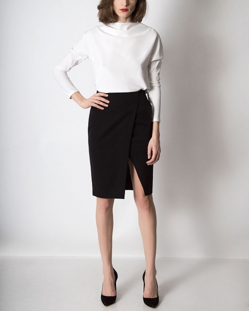 Fusta asimetrica din stofa este conceputa sa avantajeze orice silueta. Fiind foarte stramta, crapatura din fata este un detaliu sexy dar si functional, care iti permite sa misti in voie, fara a intampina dificultati cand mergi, sau cand te asezi pe scaun