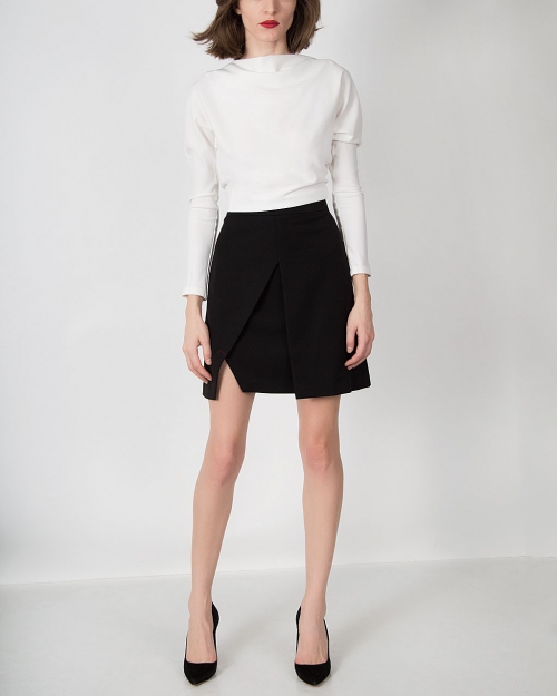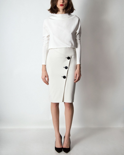 Daca nu stii ce sa porti la birou iarna asta, alege sa fii diferita! Cu fusta din stofa subtire alba, decorata cu nasturi negri in contrast, te vei face cu siguranta remarcata.