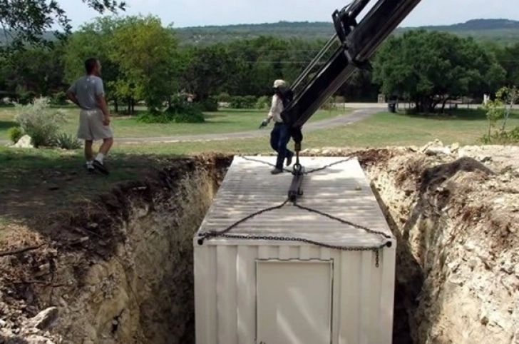 Bărbatul a cumpărat containerul de pe internet. Iniţial, acesta a înlocuit uşile duble cu una singură, mult mai rezistentă. Apoi a luat o basculantă de pietriş şi a pus-o pe fundul gropii.