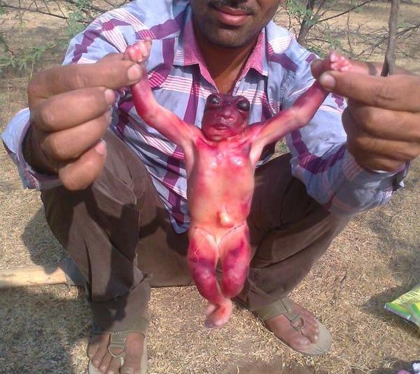 În imaginea de mai jos se vede un indian care ține în mână deasupra unei gropi o ființă humanoidă de câțiva zeci de centrimetri, cu aspect de extraterestru