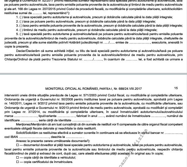 RECUPERARE TAXĂ AUTO. În Monitorul Oficial din 24.08.2017 a fost publicat OMFP nr. 1672/2017 ce adopta formularul efectiv al cererii de restituire a taxei speciale pentru autoturisme ai autovehicule, taxei pe poluare pentru autovehicule, taxei pentru emisiile poluante provenite de la autovehicule sau timbrului de mediu pentru autovehicule.