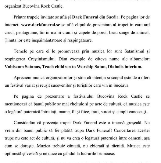 Preoţii suceveni nu privesc cu ochi buni participarea trupei suedeze Dark Funeral la Bucovina Rock Castle. Printr-un memoriu adresat autorităţilor şi semnat de preşedintele Asociaţiei „Sfântul Mitropolit Dosoftei” Suceava, preotul Justinian Remus Cojocar, se solicită interzicerea suedezilor pe motiv că ar fi satanişti.