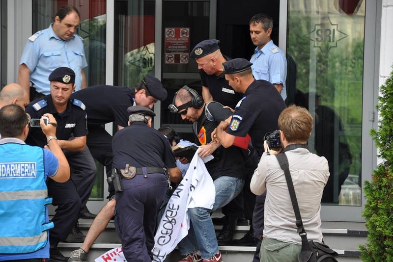 Protest în faţa sediului SRI din Bucureşti. Câţiva activişti ai organizaţiei non-guvernamentale Miliţia Spirituală au blocat intrarea în sediul central al instituţiei, în semn de protest faţă de legile supravegherii.