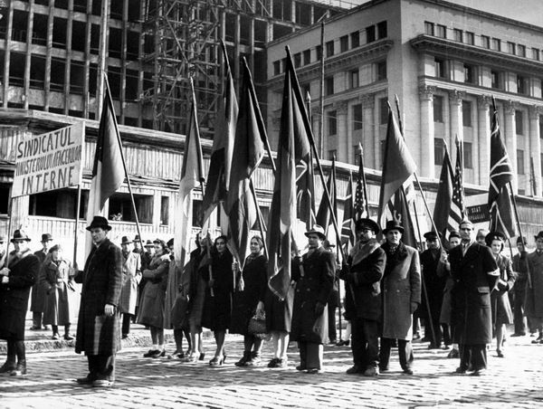 In a doua imagine, realizata in 1946, este surprins un mars al sindicatului MAI. De asemenea, in plan secund se vad lucrarile de constructie.