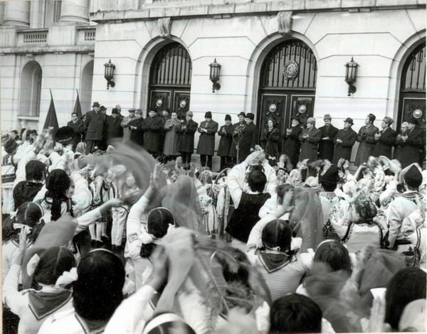 Nicolae Ceausescu le vorbeste pionierilor, chiar din fata sediului CC al PCR