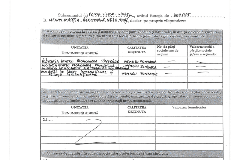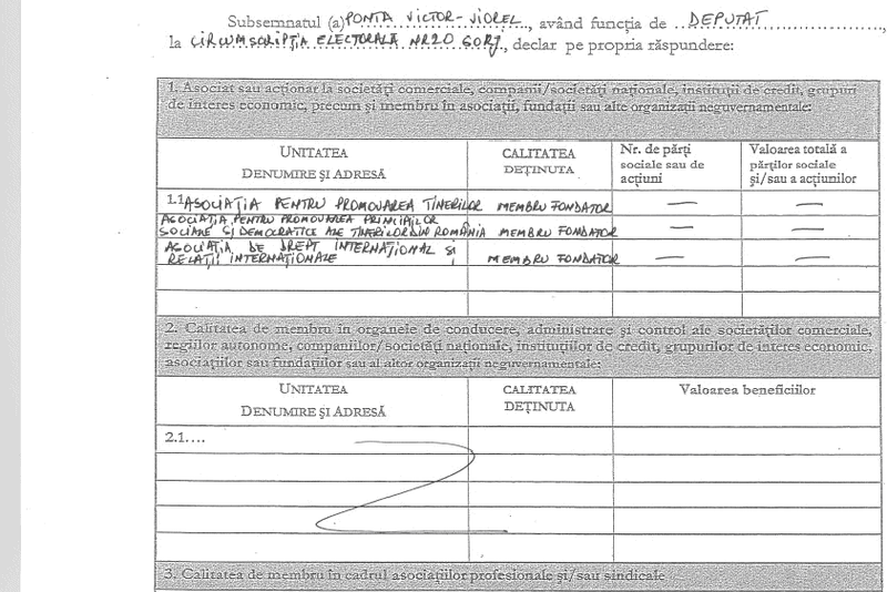Premierul Victor Ponta îşi contrazice propria declaraţie de interese, făcută în 2007. Premierul susține, în prezent, că nu a fost niciodată partener al firmei “Şova şi Asociaţii”, deşi în declaraţia de interese pe care a completat-o, în urmă cu opt ani, a scris cu mâna lui că este “SENIOR PARTNER” al casei de avocatură ,,Şova şi asociaţii". Mai mult, în alte două declarații de interese, din 20.02.2008 și 12.06.2008, se regăsește aceeași mențiune - "Senior partner 'Sova și Asociații' - SC Avocati" - Ponta precizând că este vorba despre un "parteneriat privind colaborare și asistență în cauze penale".