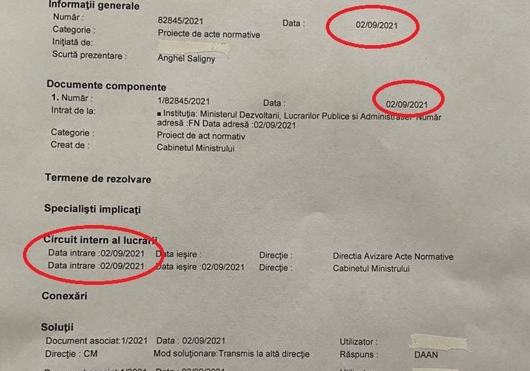 Documentul are ca dată de intrare 2 septembrie, iar Ministerul Dezvoltării este instituția care l-a trimis către Ministerul Justiției.