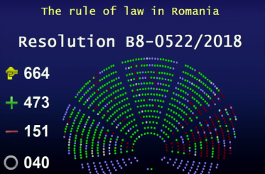 Rezoluția Parlamentului European a fost adoptată marți cu 473 voturi "pentru", 151 "împotrivă" și 40 abțineri, cu unele amendamente. A fost un vot tranpartinic, rezoluția fiind sprijinită de principalele grupări politice din parlamentul de la Strasbourg, Populari, Liberali, Verzi și inclusiv de Socialiști, în ciuda opoziției eurodeputaților PSD.
