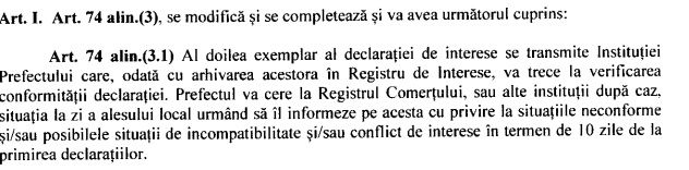 Iată conţinutul actual al alineatului 3, articolul 74, potrivit căruia al doilea exemplar al declaraţiei de avere se transmite la secretarul general al Prefecturii: