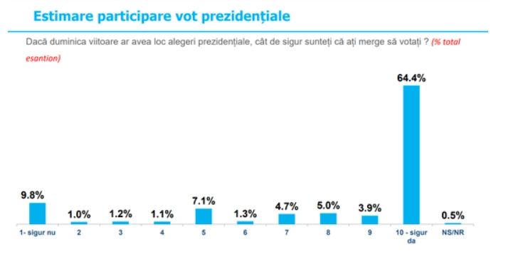 Pe o scară de la 1 la 10, în care 1 înseamnă că ”sigur nu” vor merge la vot la alegerile prezidenţiale şi 10 ”sigur da” vor merge la vot, 9,8% dintre români au ales 1, 1% au ales 2, 1,2% au ales 3, 1,1% au ales 4, 7,1% au ales 5, 1,3% au ales 6, 4,7% au ales 7. 5% indică 8, 3,9% aleg 9 şi 64,4% indică 10. 0,5% nu ştiu sau nu răspund la această întrebare.