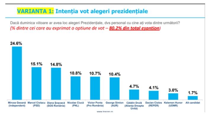 Dacă duminica viitoare s-ar organiza alegeri prezidenţiale, din cei 80,2% dintre români care au o opţiune de vot clară, 24,6% l-ar alege pe Mircea Geoană (candidat independent), 15,1% i-ar da votul lui Marcel Ciolacu (PSD) şi 14,8% ar pune ştampila de vot pe Diana Şoşoacă (din partea SOS România).