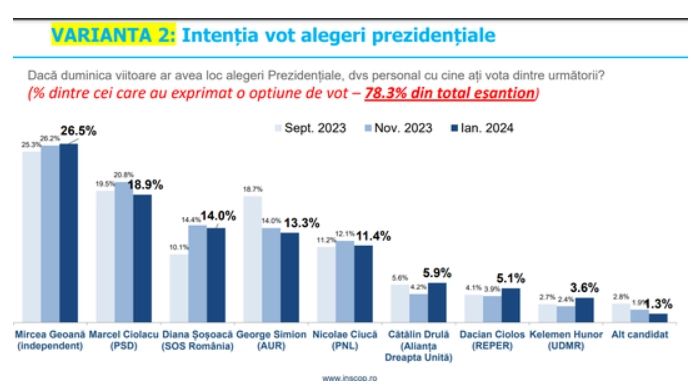 În varianta de candidaţi testată inclusiv în septembrie şi noiembrie 2023, dacă duminica viitoare ar fi chemaţi să voteze noul preşedinte al României, din cei 78,3% dintre români care au o opţiune de vot, 26,5% l-ar alege pe Mircea Geoană, candidat independent, (25,3% în septembrie şi 26,2% în noiembrie 2023), 18,9% ar pune ştampila pe Marcel Ciolacu, candidat din partea PSD (19,5% în septembrie şi 20,8% în noiembrie 2023) şi 14% pe Diana Şoşoacă, din partea SOS România (10,1% în septembrie şi 14,4% în noiembrie 2023).