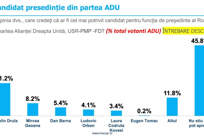 În cazul votanţilor Alianţei Dreapta Unită, 21,2% consideră că cel mai potrivit candidat la Preşedinţie ar fi liderul USR Cătălin Drulă, acesta fiind urmat de Mircea Geoană, Dan Barna, Ludovic Orban, Laura Codruţa Koveşi.