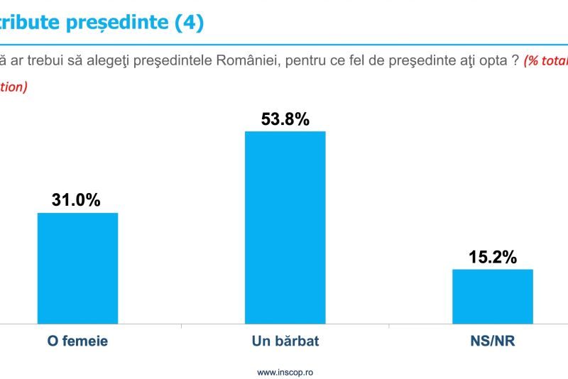Tot peste 50% preferă un bărbat ca preşedinte, varianta unei femei la Cotroceni fiind aleasă de 31% dintre cei chestionaţi.