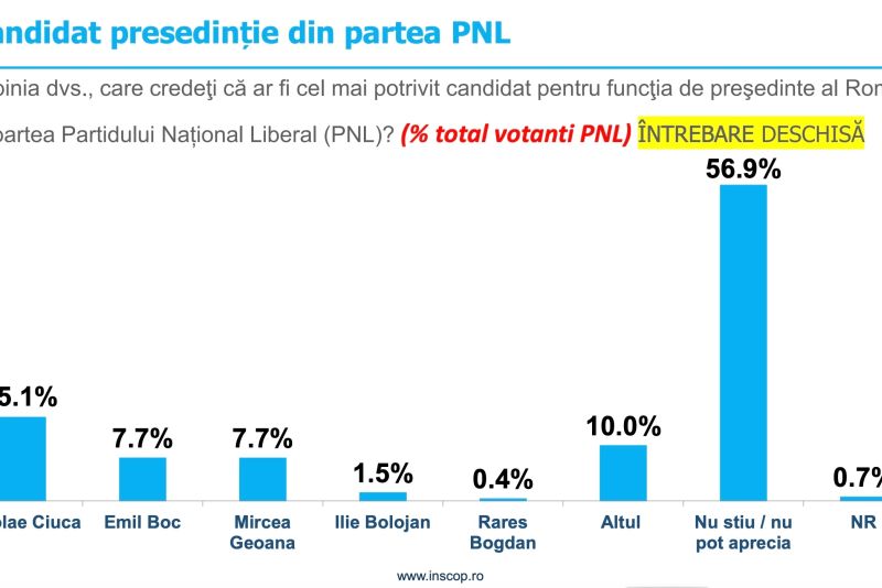 Dintre votanţii PNL, 15,1% îl indică drept candidatul cel mai potrivit din partea formaţiunii pe Nicolae Ciucă, urmat de Emil Boc şi de Mircea Geoană, care sunt la egalitate.