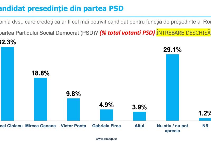Acelaşi sondaj mai relevă că, dintre votanţii PSD, aproape o treime îl consideră pe Marcel Ciolacu cel mai potrivit candidat la Preşedinţie al partidului, urmat de Mircea Geoană şi de Victor Ponta.
