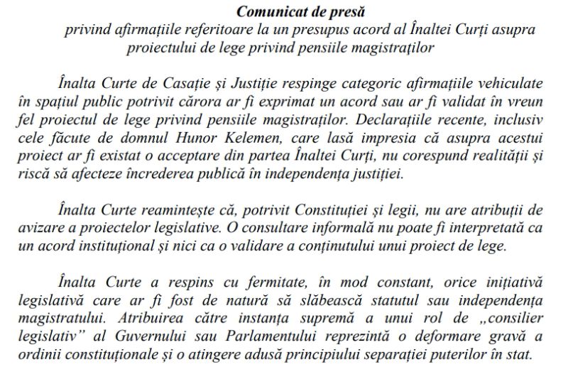 Înalta Curte de Casație și Justiție respinge categoric speculațiile lansate în spațiul public chiar de către lideri politici, potrivit cărora ICCJ „ar fi exprimat un acord sau ar fi validat în vreun fel proiectul de lege privind pensiile magistraților”. Într-un comunicat semnat chiar de președintele instituției, Lia Savonea, este indicat nominal liderul UDMR, Kelemen Hunor, care a afirmat că Guvernul ar fi trimis „informal” către Curtea Constituțională proiectul legii pensiilor magistraților, înainte ca acesta să fie adoptat.