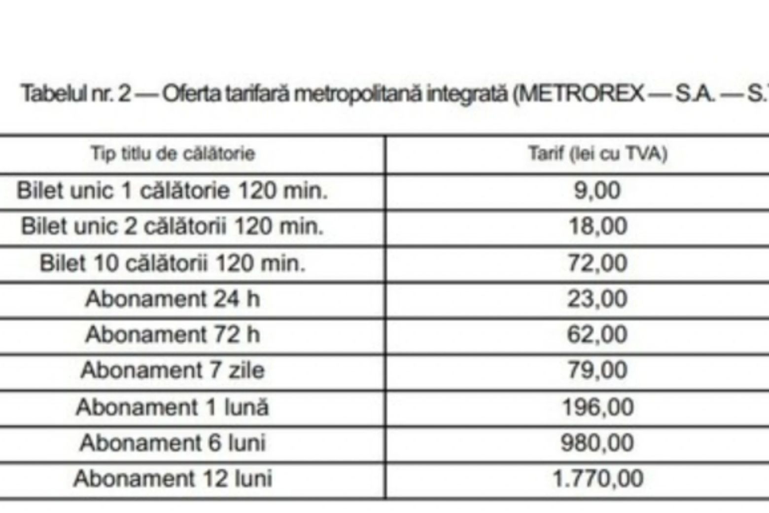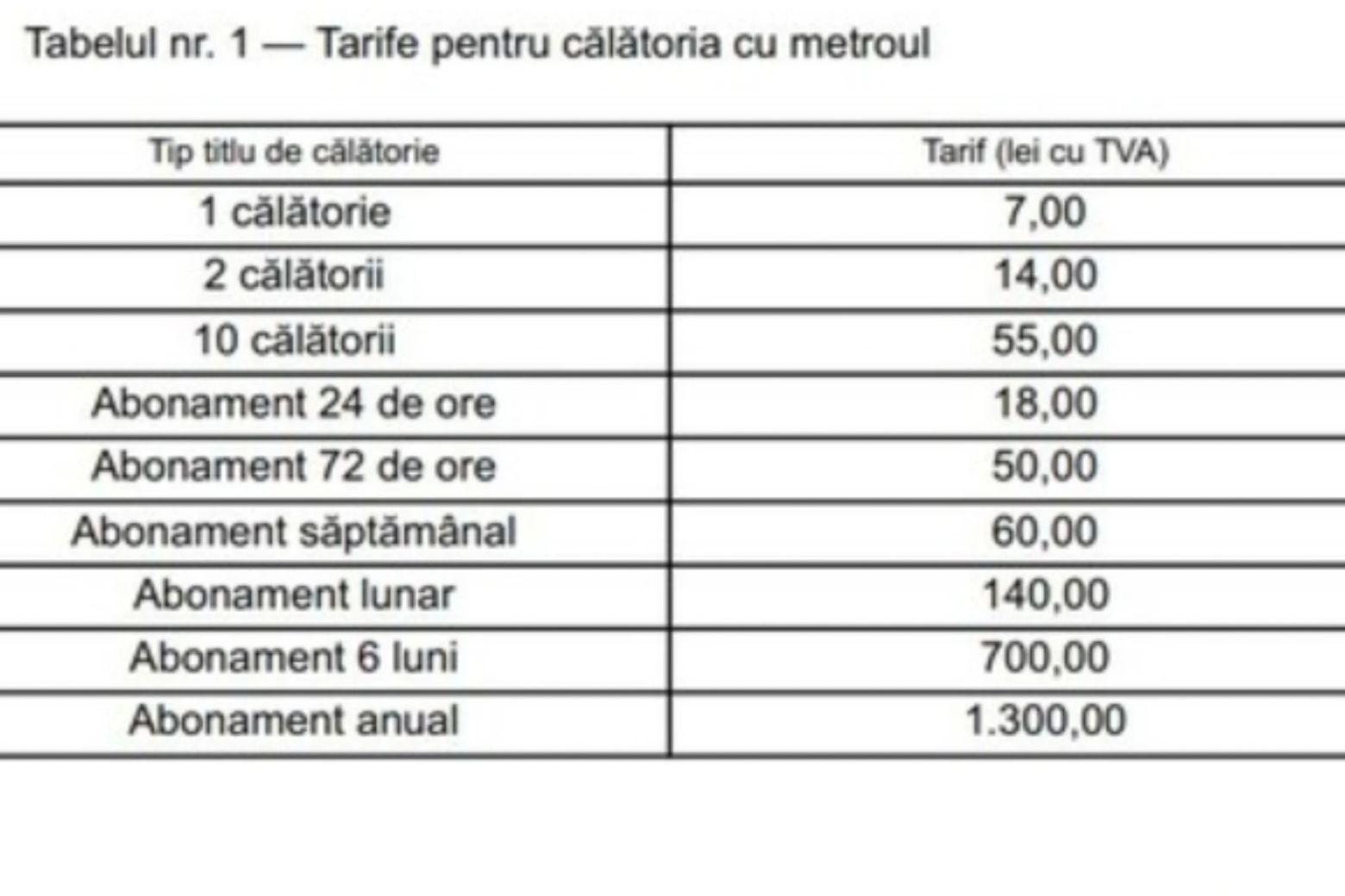 Ordinul ministrului Transporturilor privind majorarea tarifelor la metrou a fost publicat în Monitorul Oficial, iar noile prețuri vor intra în vigoare de la 1 mai. Astfel, costul unei călătorii crește de la 5 la 7 lei, iar abonamentul lunar se scumpește de la 100 la 140 de lei.