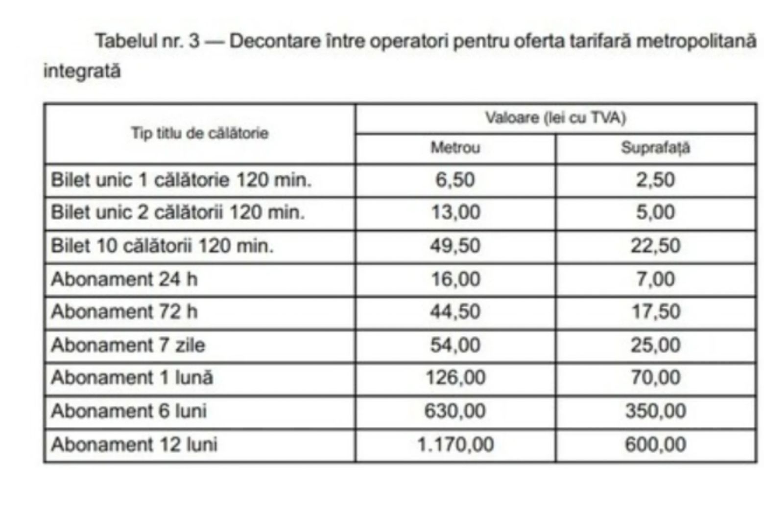 ”Titlurile de călătorie cu valabilitate de 120 de minute, 24 şi 72 de ore acceptă ultima validare cu un minut înainte de expirarea perioadei stabilite şi permit călătoria până în ultimul minut al valabilităţii pe liniile S.T.B. — S.A. şi până la ieşirea din staţie de la METROREX — S.A. Acestea permit un număr nelimitat de validări în limita de timp prevăzută”, se mai arată în ordinul publicat în Monitorul Oficial.