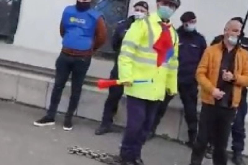 Revoltați pe acțiunea jandarmilor de a delimita protestul, oamenii legii au aruncat cu fumigene. Jandarmii au confiscat mai multe pungi în care manifestanții țineau fumigenele.