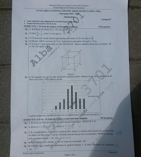 Rezolvări matematică Evaluare Nationala 2016.În vederea asigurării desfășurării corecte a evaluării naționale pentru absolvenții clasei a VIII-a, în conformitate cu prevederile reglementărilor în vigoare, comisiile din unitățile de învățământ și comisiile județene/ comisia municipiului București de organizare a evaluării naționale pentru absolvenții clasei a VIII-a verifică, prin sondaj, înregistrările audio-video din sălile de examen, după încheierea probei scrise. În cazul în care, la verificarea prin sondaj, se constată nereguli, fraude sau tentative de fraudă ori în cazul în care există sesizări privitoare la nereguli, fraude sau tentative de fraude, verificarea se face pentru înregistrările din toate sălile de examen din unitatea de învățământ respectivă.