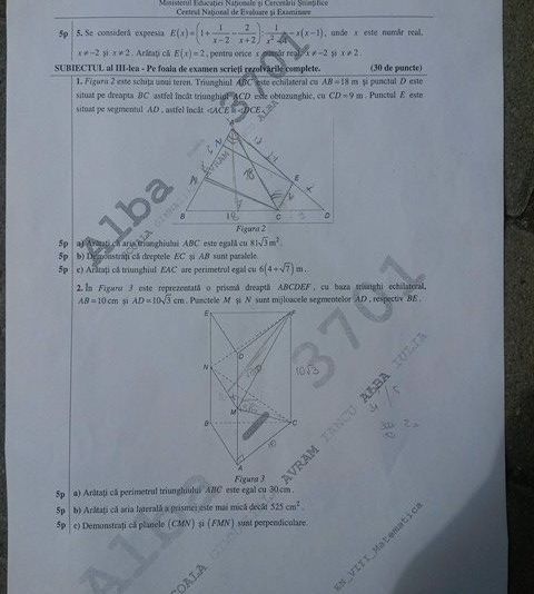 Rezolvări matematică Evaluare Nationala 2016.Se interzice candidaților să aibă, în sălile de examen, asupra lor, în obiectele de îmbrăcăminte sau încălțăminte, în penare și altele asemenea, sau în băncile în care sunt așezați în sălile de examen, telefoane mobile, căști audio, precum și orice mijloc electronic de calcul sau de comunicare/care permite conectarea la internet/la rețele de socializare, care ar putea fi utilizate pentru rezolvarea subiectelor, pentru efectuarea calculelor, pentru comunicare între candidați sau cu exteriorul.