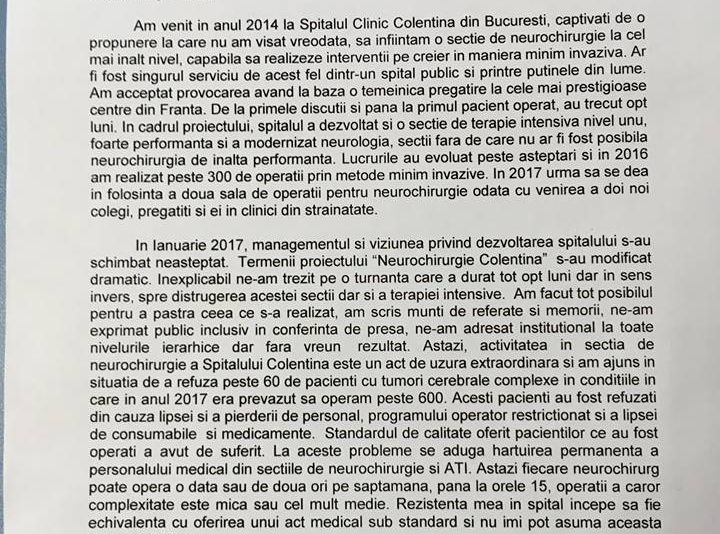 Astăzi, 4 septembrie 2017, am demisionat împreună cu colegul meu Dr Bica din funcția deținută la Spitalul Colentina. Este o decizie incredibil de grea, dar nu am găsit altă soluție.