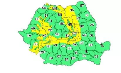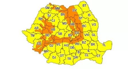 Administrația Națională de Meteorologie a emis, sâmbătă, avertizări meteo cod portocaliu și cod galben de vreme severă.