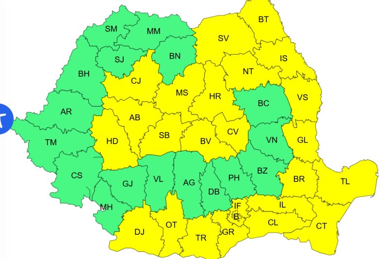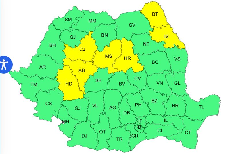Marți, între orele 10:00 și 20:00, un nou Cod Galben vizează județele Botoșani, Iași, Harghita, Mureș, Cluj, Alba și Hunedoara, unde temperaturile vor rămâne deosebit de scăzute, situându-se între –8 și –4 grade, iar în văi și depresiuni putând coborî spre –10 grade.