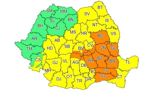 Administrația Națională de Meteorologie a prelungit avertizările cod portocaliu și cod galben de vreme rea, valabile pentru mai multe zone din țară.