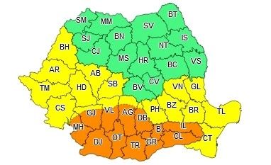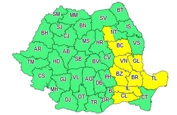 În intervalul menționat, local în Moldova, Dobrogea, precum și în jumătatea de est a Munteniei vor fi perioade cu instabilitate atmosferică accentuată ce se va manifesta prin frecvente descărcări electrice, intensificări ale vântului (rafale în general de 55...70 km/h), vijelii, averse ce vor avea și caracter torențial (în intervale scurte de timp cantitățile de apă vor fi de 20...25 l/mp și izolat peste 30 l/mp) și grindină.