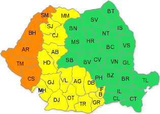 În judeţele Satu Mare, Bihor, Arad, Timiş, Caraş-Severin vor fi temperaturi maxime de 37...38 de grade, iar disconfortul termic va fi deosebit de accentuat. În aceste judeţe se va institui cod portocaliu.