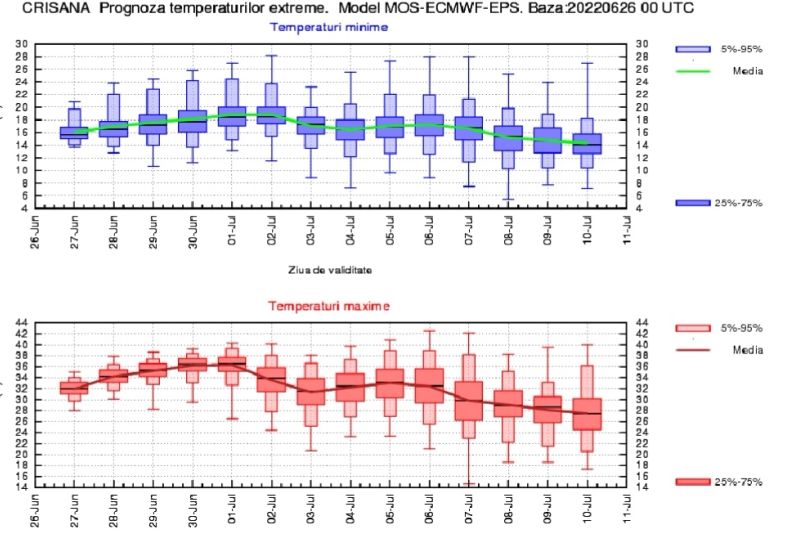 Şi în Crişana, până în data de 1 iulie vremea se va încălzi, va deveni caniculară, iar media maximelor termice va ajunge să se situeze în jurul a 37 de grade. Vor creşte şi minimele termice, a căror medie va urca în dimineaţa zilei de 2 iulie până spre 19-20 de grade. În zilele următoare valorile termice vor începe să scadă, astfel că la finalul intervalului de prognoză media temperaturilor maxime se va situa în jurul valorii de 28 de grade, iar a minimelor între 13 şi 15 grade. Probabilitatea pentru averse va fi mai ridicată începând cu data de 2 iulie.