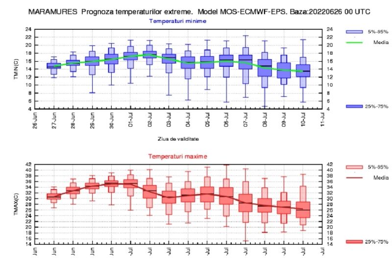 Până în jurul datei de 1 iulie vremea se va încălzi şi în Maramureş, iar din 29 iulie, local, va fi şi caniculă, cu o medie a maximelor termice, pe întreaga regiune, în jurul a 35 de grade. Media minimelor termice va urca de la 15 grade în prima zi, până la 17-18 grade în dimineaţa zilei de 2 iulie. În zilele care vor urma valorile termice vor începe să scadă treptat, iar la finalul intervalului de prognoză media maximelor termice va ajunge să se situeze între 25 şi 27 de grade, iar a minimelor între 12 şi 14 grade. Din data de 1 iulie vor fi averse aproape zilnic.