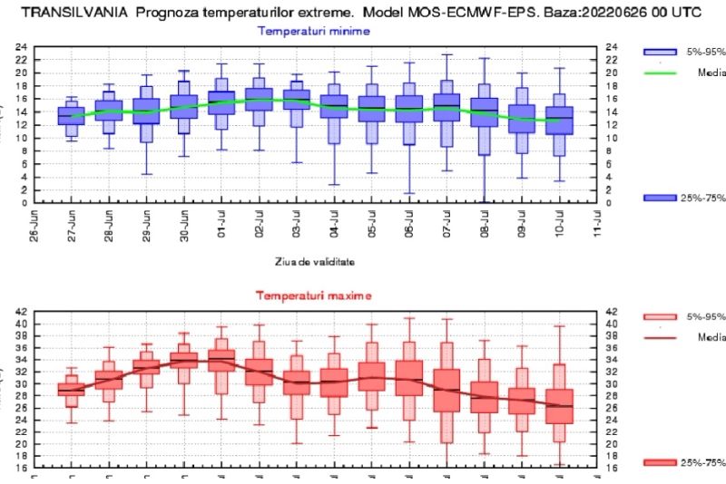 În Transilvania, până spre finalul primei săptămâni vremea se va încălzi, iar din data de 29 iunie va deveni local caniculară, cu o medie a maximelor termice pe întreaga regiune de 34-35 de grade. Va creşte şi media minimelor termice, ce se va situa între 13 şi 16 grade. În zilele care vor urma valorile termice vor scădea treptat, iar la finalul intervalului de prognoză maximele vor ajunge în medie să se situeze în jurul a 26 de grade, iar media minimelor va avea valori între 12 şi 14 grade. Vor fi averse în fiecare zi, până la finalul lunii iunie, pe suprafeţe mici, apoi pe arii mai extinse.